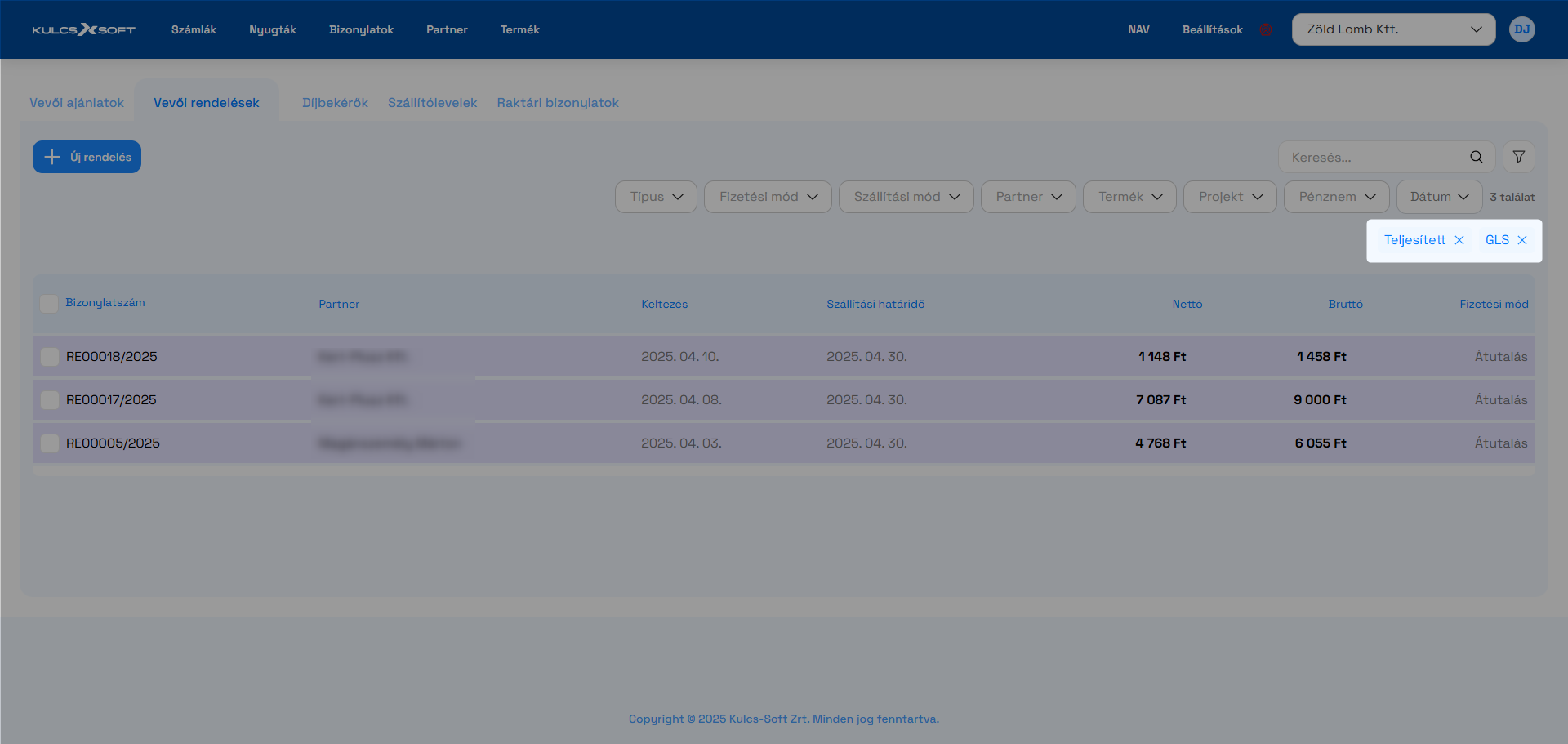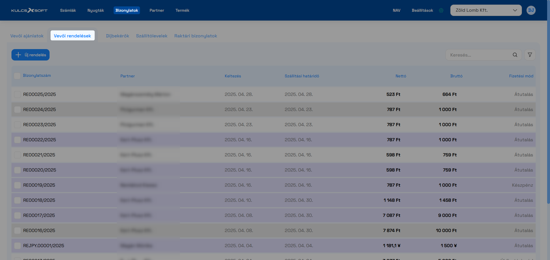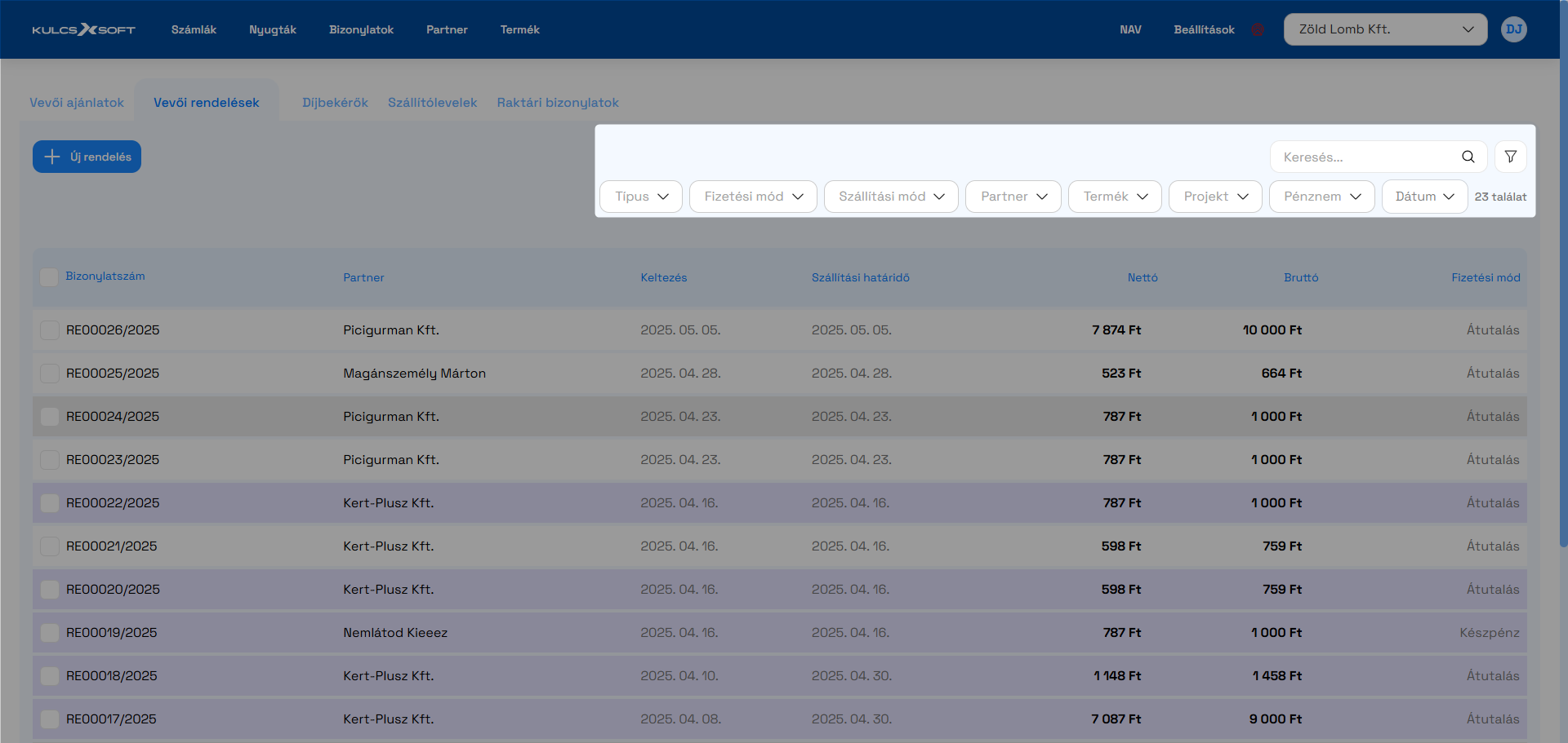 - Keresés: Szabadszöveges keresőmező, melynek segítségével szűkíthetjük listánkat a bizonylatszám, a partner neve és a bizonylatokon szereplő megjegyzések részleteinek megadásával.