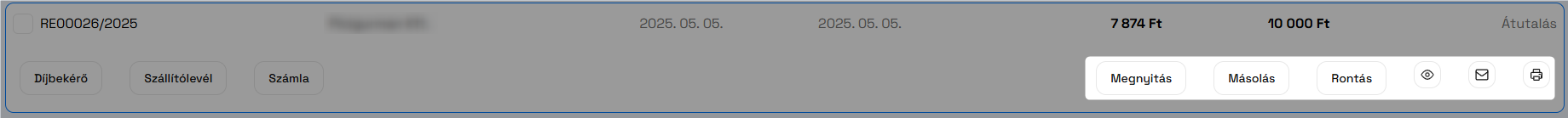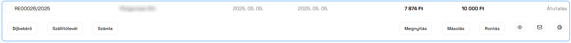 Egy adott bizonylat sorra kattintva megjelennek azok az akciók, amelyeket a kijelölt bizonylatunkon végre tudunk hajtani.