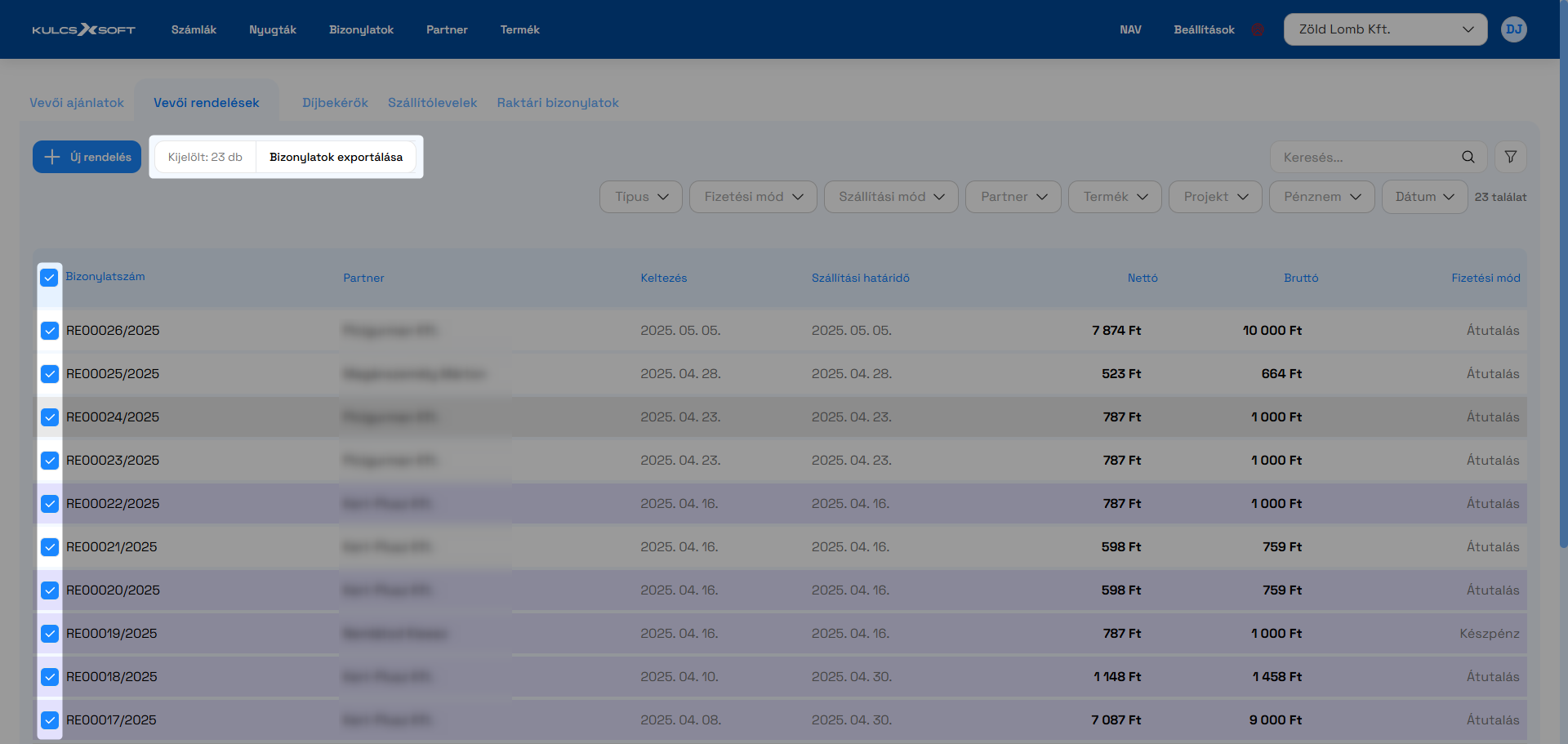 Listánk elején található jelölőnégyzetek segítségével több bizonylat kijelölésére van lehetőségünk, ami megnyitja számunkra a csoportos műveletek lehetőséget.