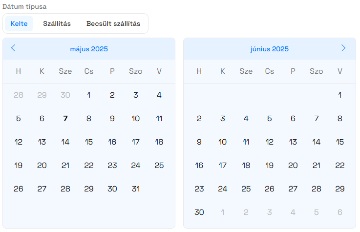 - Dátum: Egy adott dátumra vagy intervallumra van lehetőségünk szűrni. A dátum szűrőben lehetőségünk van kelte, esedékesség és becsült szállítási dátum alapján is szűrni.