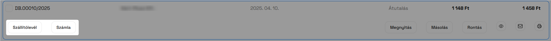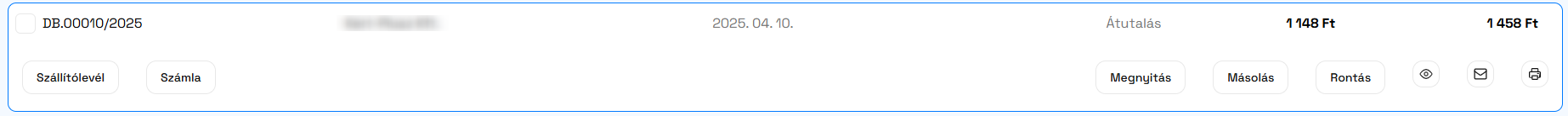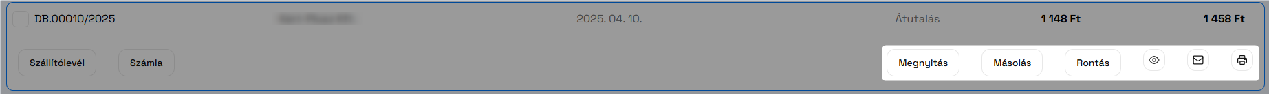 Egy adott bizonylat sorra kattintva megjelennek azok az akciók, amelyeket a kijelölt bizonylatunkon végre tudunk hajtani.