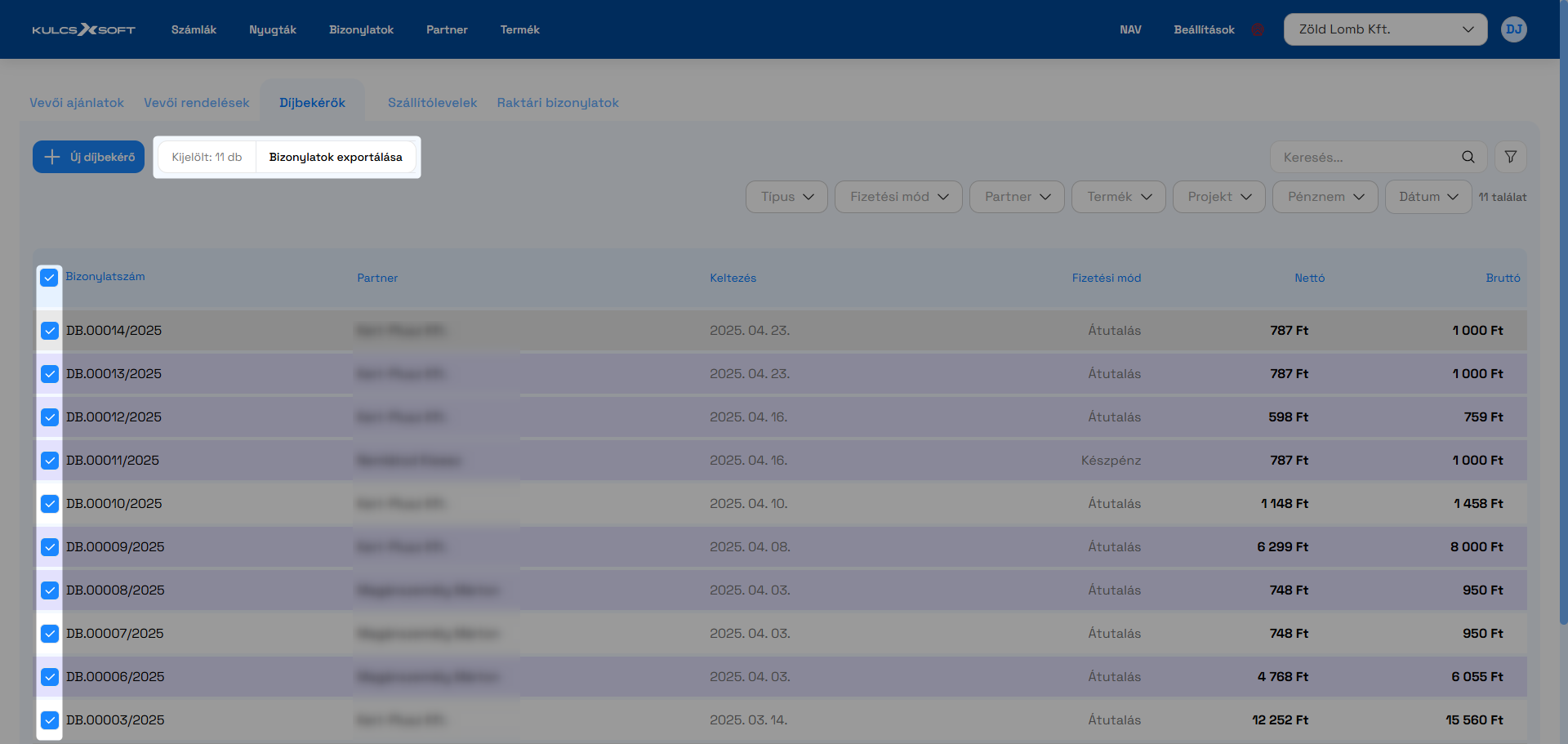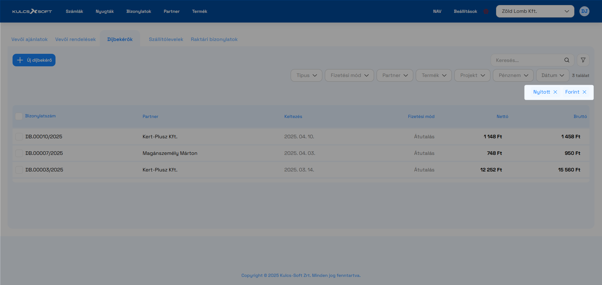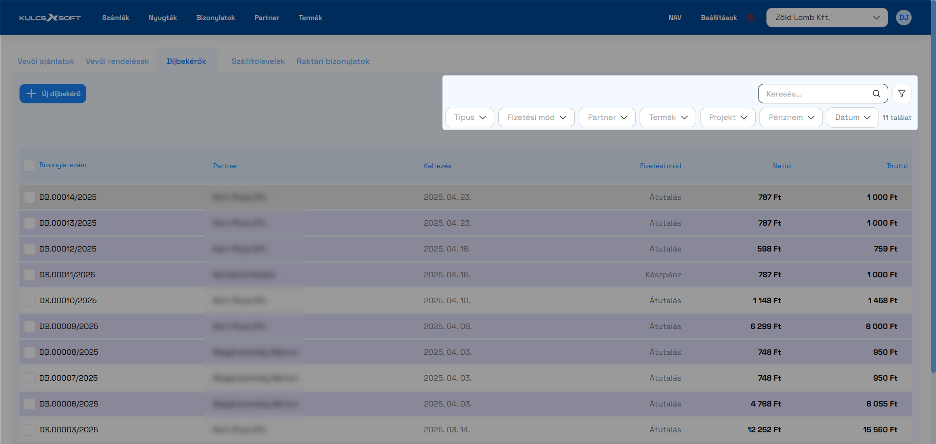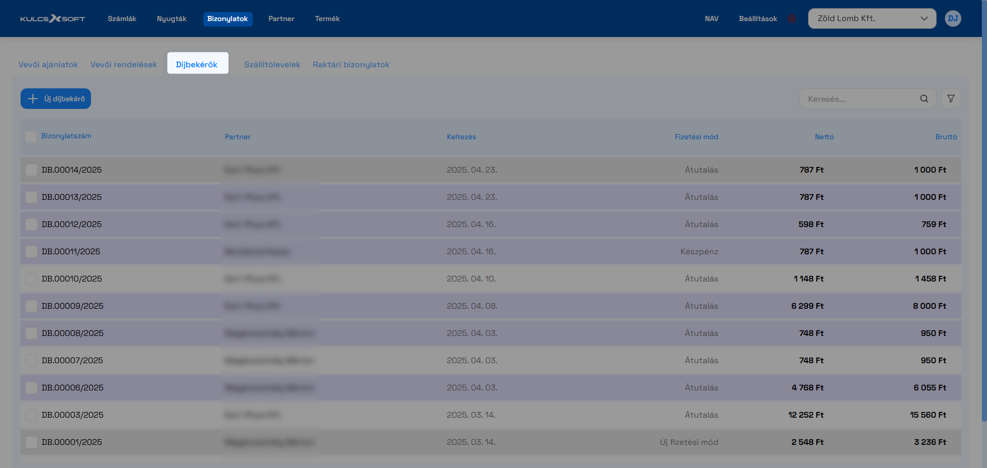 Az elmentett díjbekérőink a Bizonylatok/Díjbekérők menüpont alatt található listából kereshetők vissza.