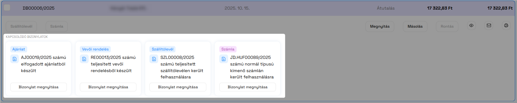 A Flow megjeleníti a kapcsolódó bizonylatokat minden olyan bizonylat esetében, ami egy bizonylatlánc tagja és innen közvetlenül meg is nyitható valamennyi bizonylat az adott bizonylatláncból.