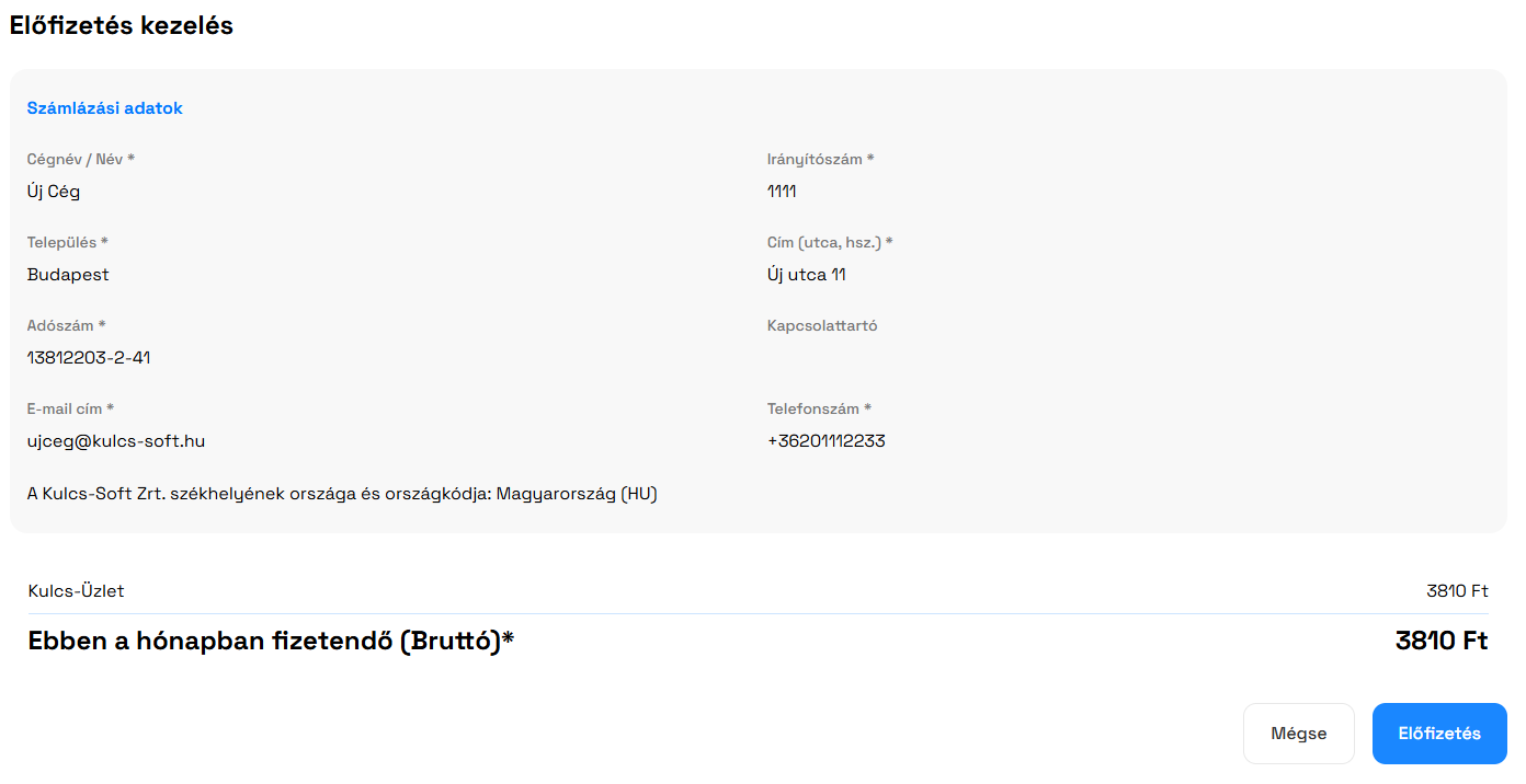 Miután kitöltöttük a szükséges adatokat és a Tovább gombra kattintottunk, az összesítőben át tudjuk tekinteni a megadott adatainkat és az előfizetés adatait.