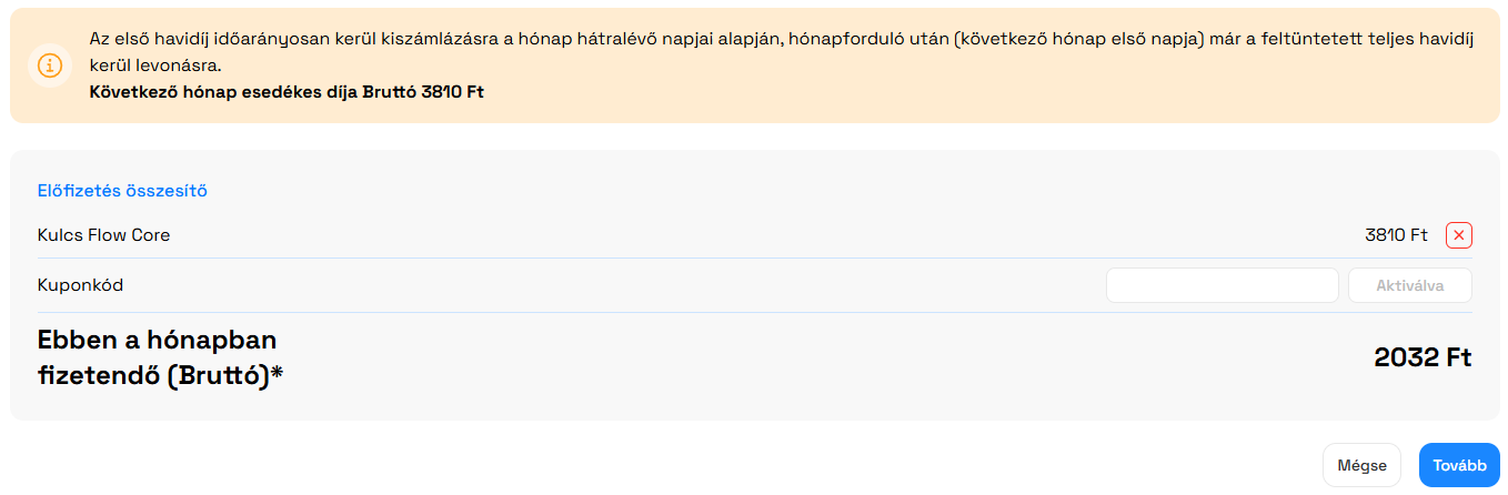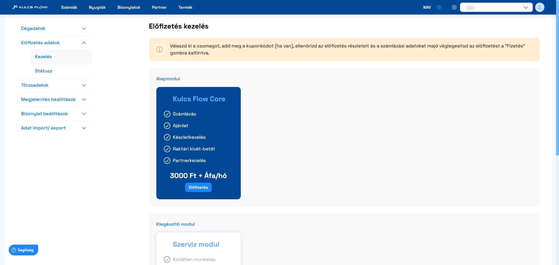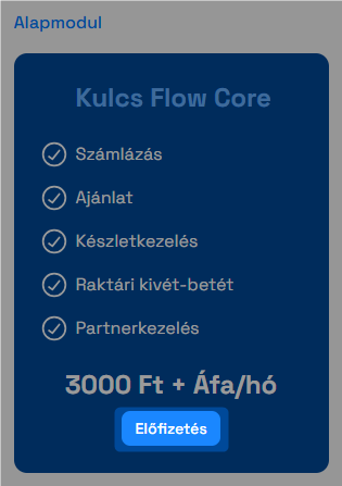 Abban az esetben ha regisztráltunk a Kulcs Flow-ba, akkor a Kulcs Flow Core funkcionalitását 14 napig ingyenesen kipróbálhatjuk mindenféle kötöttség nélkül. A próbaidőszak lejártával fiókunk Kulcs Flow Free funkcionalitással működik tovább.