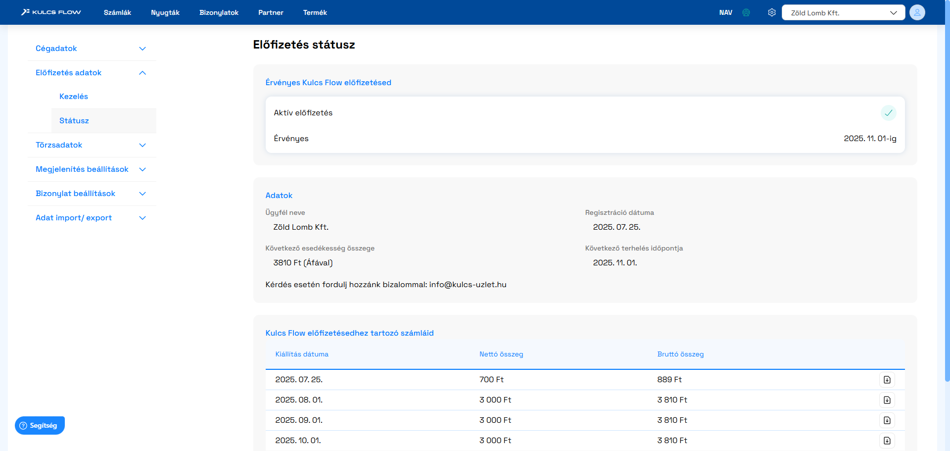 Előfizetésünk státuszát lehetőség van megtekinteni Kulcs Flow fiókunkon belül. A Beállítások/Előfizetési adatok/Státusz menüpontra navigálva láthatjuk előfizetésünk aktuális állapotát, érvényességét és amennyiben volt/van aktív előfizetésünk, az előfizetés időszakaira vonatkozó számlák is letölthetők a felületről.