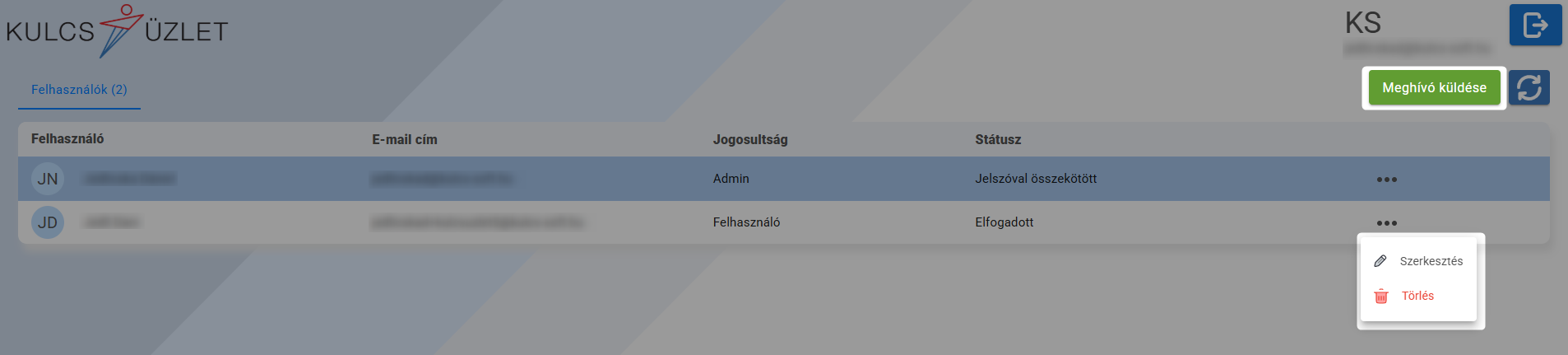 A menüpont megnyitásával megjelenik a cégfiókhoz tartozó felhasználói hozzáférések felület, ahol lehetőség van meghívó kiküldésére és a meglévő hozzáférések jogosultságának módosítására vagy törlésére. Ezen műveleteket csak admin jogosultsággal rendelkező felhasználók végezhetik el.