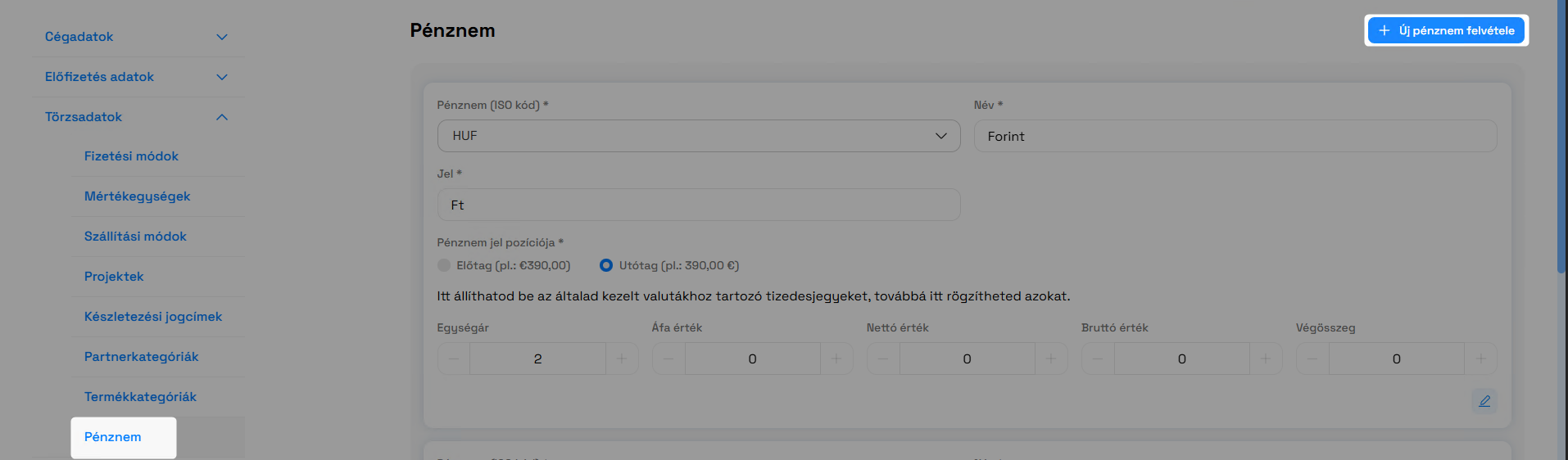 A menüpont alatt lehetőség van új pénznemek rögzítésére.