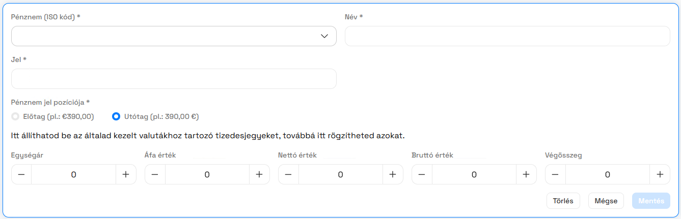 Új pénznem rögzítéséhez ki kell választanunk az ISO kódot, meg kell adnunk pénznemünk nevét és jelét. Ezen felül beállítható, hogy a pénznem jelének pozicíója előtag vagy utótagként jelenjen meg, illetve beállítható, hogy a pénznemhez tartozó különböző értékek hány tizedes pontosságig legyenek kerekítve.