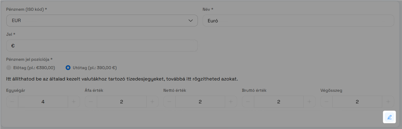 A korábban felrögzített pénznemek szerkesztése/törlése a szerkesztés gomb megnyomásával érhető el.