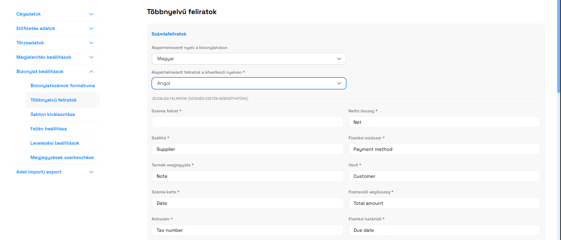 A többnyelvű feliratok menüpont alatt az idegen nyelvű bizonylatfeliratok szerkesztését tudjuk elvégezni. Az idegen nyelvek esetében angol, német és egy egyedi választható nyelv paraméterezésére van lehetőség.