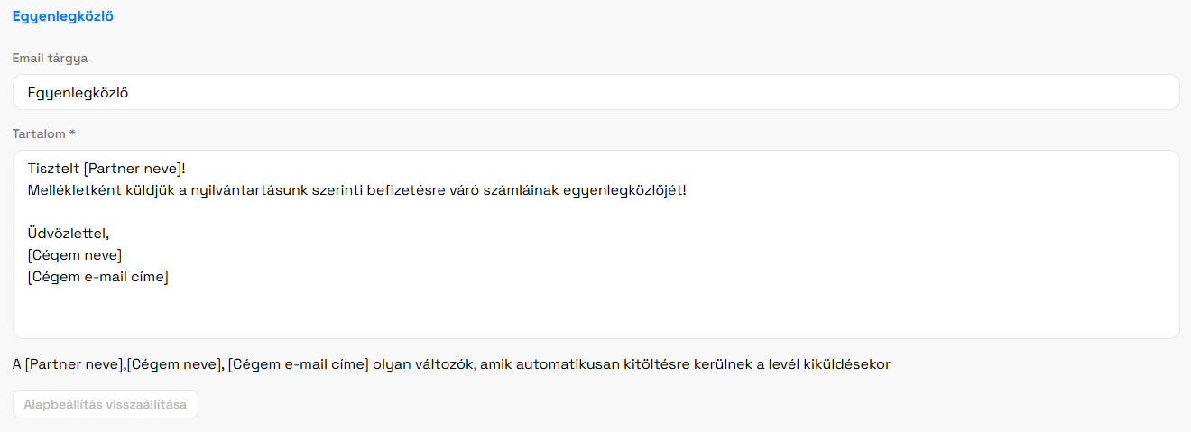 Egyenlegközlők esetén az alábbi változók használhatók: [Partner neve], [Cégem neve], [Cégem e-mail címe]