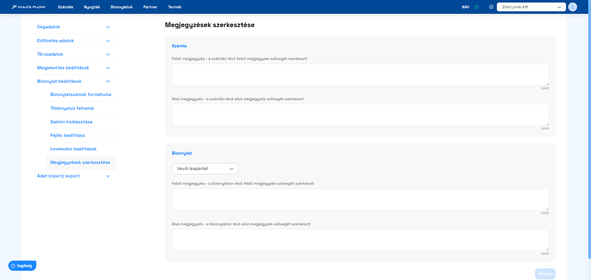 A megjegyzések szerkesztése menüpont alatt számláink és bizonylataink alsó- és felső megjegyzéseit szerkeszthetjük, amennyiben szeretnénk ezeket valamilyen alapértelmezett értékkel ellátni.