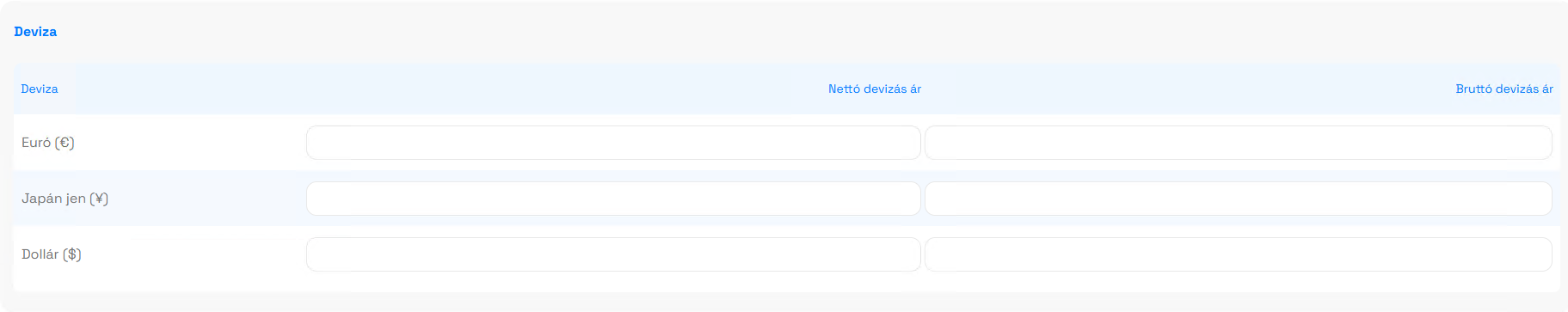 - Deviza: A programban felrögzített devizákhoz tartozóan is külön megszabhatjuk a nettó és bruttó árainkat. Kitöltésük esetén a program az alapértelmezett egységár árfolyammal történő átszámítása helyett a termék adatlapon meghatározott értékekkel fog dolgozni a devizás bizonylatokon.