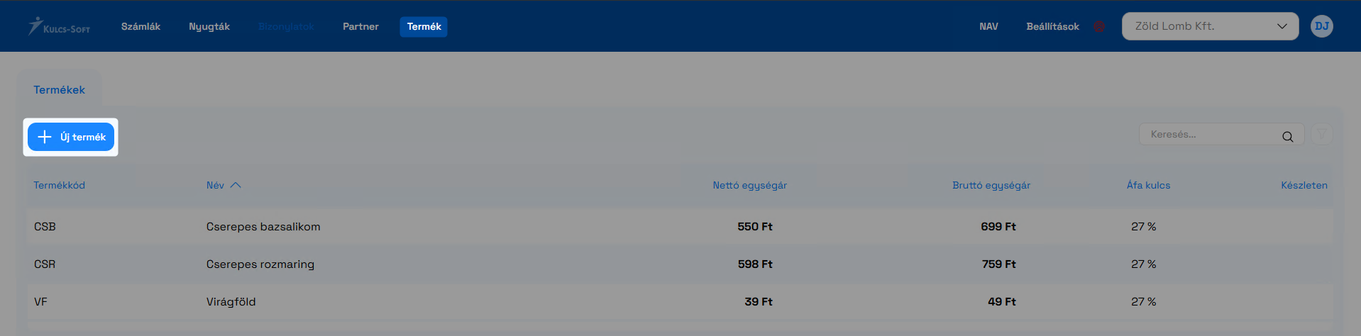 Új termék rögzítése a Termék listában az Új termék funkció segítségével lehetséges.