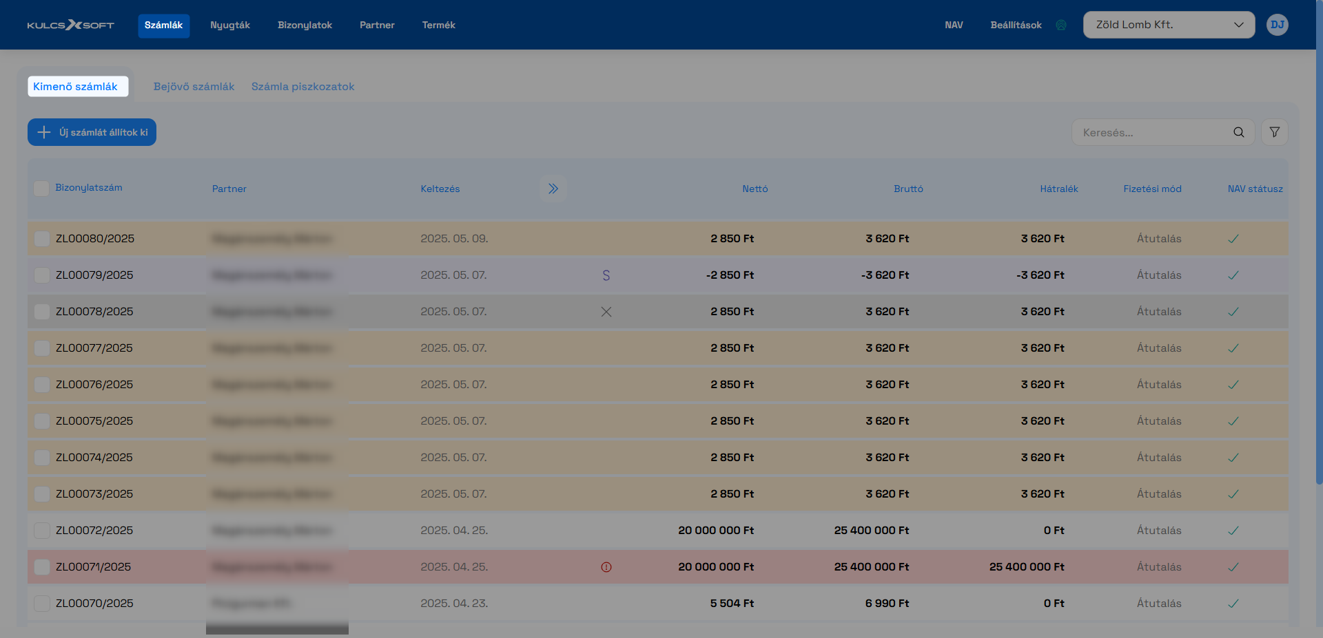 - Keresés: Szabadszöveges keresőmező, melynek segítségével szűkíthetjük listánkat a bizonylatszám, a partner neve és a bizonylatokon szereplő megjegyzések részleteinek megadásával.