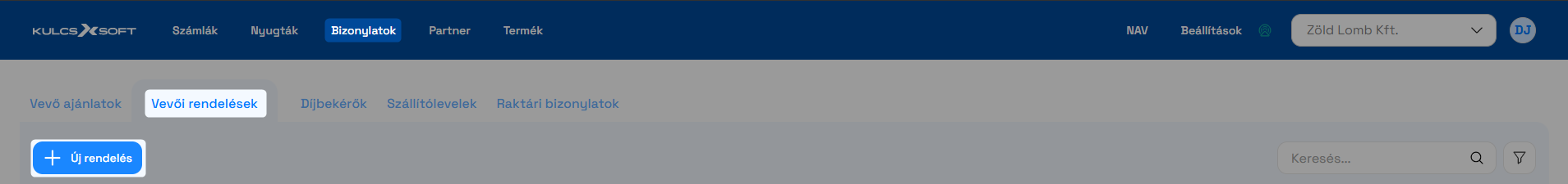 Új vevői rendelés rögzítésére a Bizonylato/Vevői rendelések/Új rendelés menüpont ad lehetőséget.