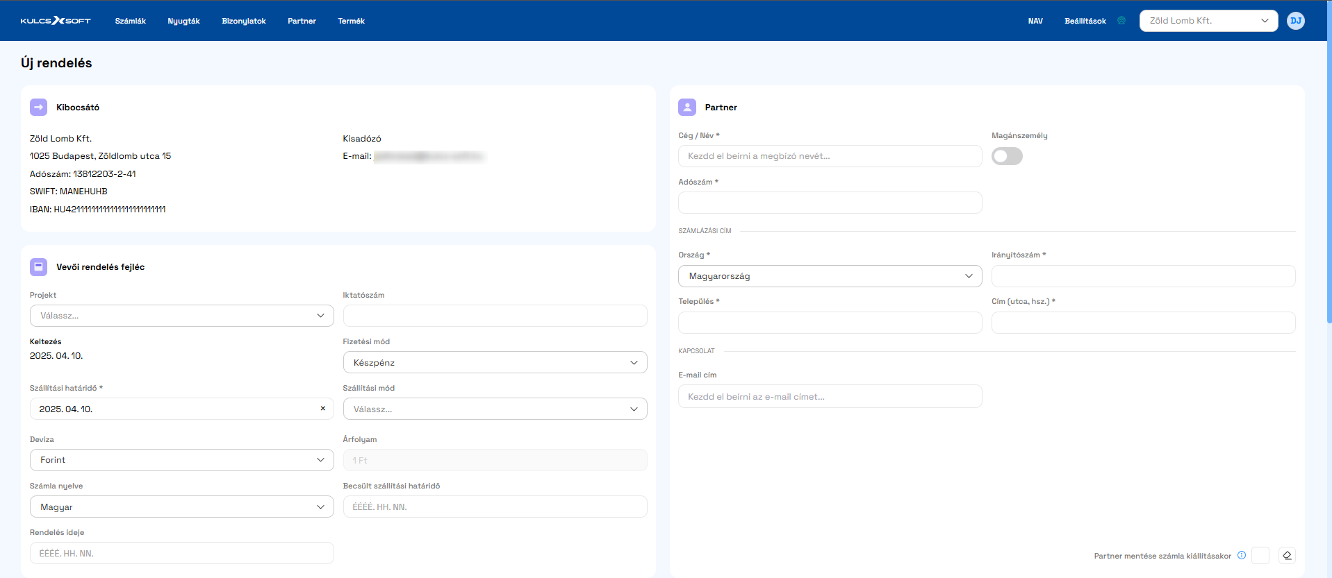 - Adószám: Partnerünk adószámának megadására szolgál. Magánszemélyek esetén nem tölthető ki.