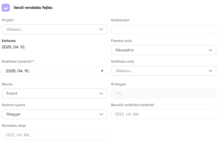 - Rendelés ideje: Kitöltése kötelező, alapértelmezetten az aktuális dátummal töltődik. A megrendelés leadásának idejét jelzi.