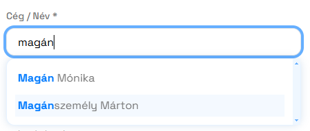 - Cég/Név: Partnerünk neve, cégneve. A mező már korábban rögzített partnerek keresésére is alkalmas, amennyiben elkezdjük partnerünk nevét beírni, akkor partnerlistánkból fel fogja ajánlani a találatokat: