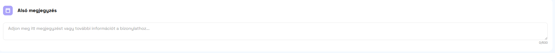 Amennyiben bármilyen további információt fel szeretnénk tűntetni bizonylatunk nyomtatási képének legalsó szektorában, azt az alsó megjegyzés blokkban tehetjük meg. Szabadszöveges mező, maximális hossza 500 karakter lehet.