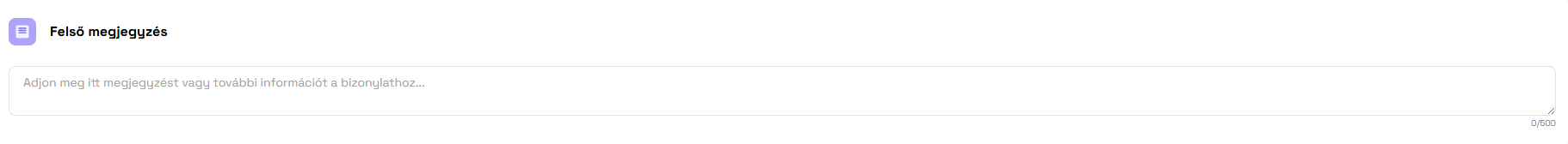 Amennyiben bármilyen további információt fel szeretnénk tűntetni bizonylatunk nyomtatási képén a fejléc alatti szektorban, azt a felső megjegyzés blokkban tehetjük meg. Szabadszöveges mező, maximális hossza 500 karakter lehet.
