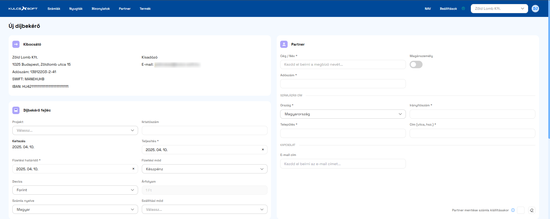 - Adószám: Partnerünk adószámának megadására szolgál. Magánszemélyek esetén nem tölthető ki.