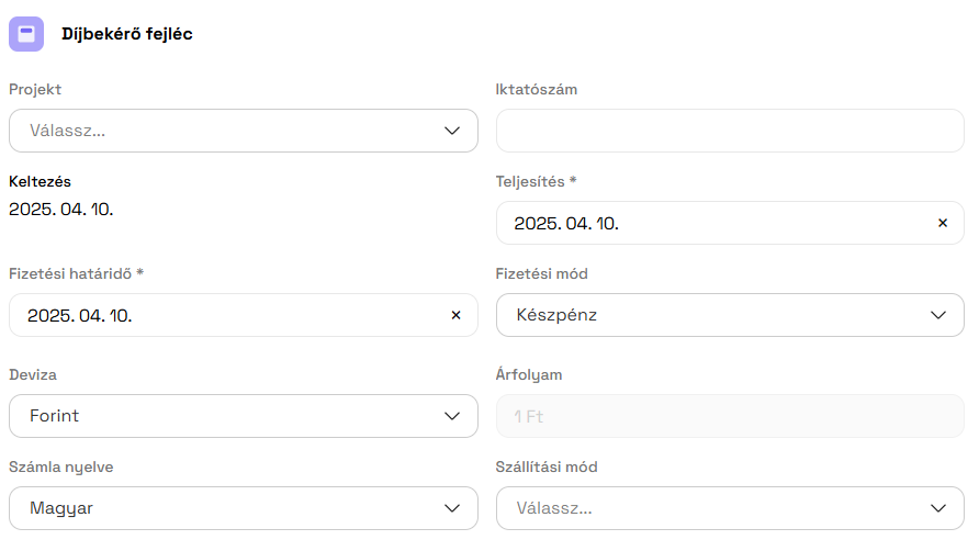 - Keltezés: Bizonylatunk kelte dátuma. A mai napi dátummal kerül automatikusan kitöltésre, nem módosítható.