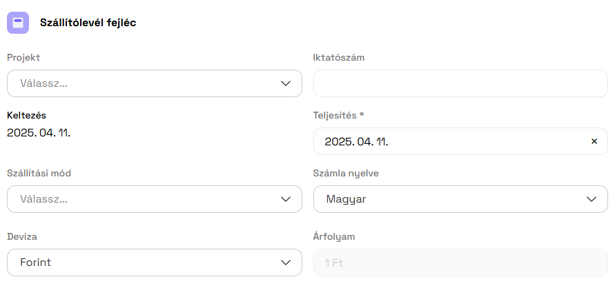 - Teljesítés: Bizonylatunk teljesítési dátuma, manuálisan állítható. Kötelező mező.