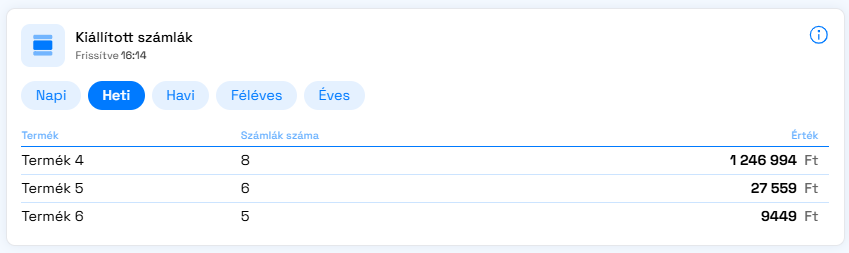 Kiállított számláink alapján kilistázza a TOP 3 értékesített tételünket napi, heti, havi, féléves és éves viszonylatban. A kijelölt időszakot mindig a mai naptól visszamenőlegesen számítja a Flow.