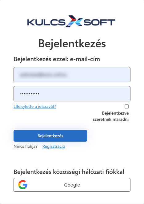 A sikeres regisztrációt követően fiókunkkal a bejelentkezési felületen keresztül tudunk belépni a Kulcs Flowba. Kulcs-Felhasználó esetén e-mail cím + jelszó megadásával, Gmail fiók esetén pedig a Google funkció használatával.