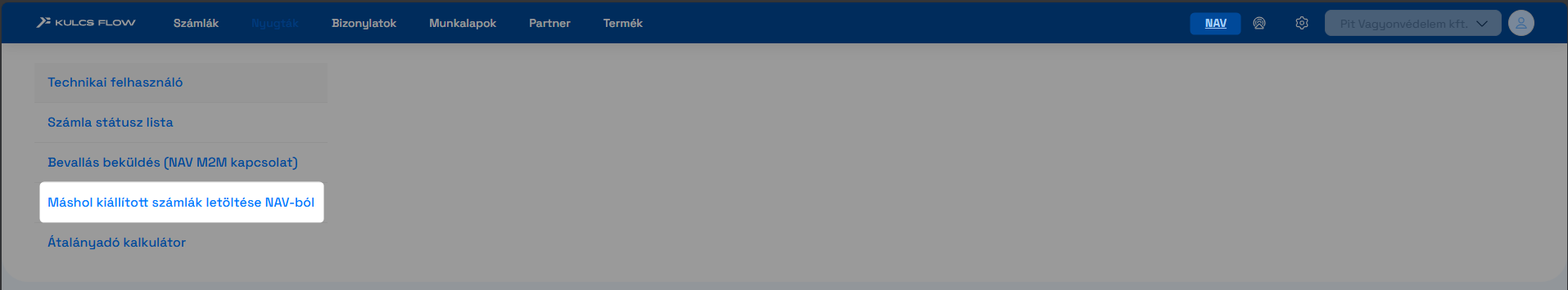 A funkció a NAV/Máshol kiállított számlák letöltése menüpont alatt érhető el.