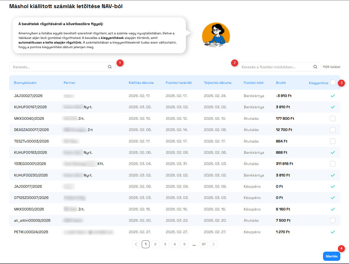 A lekéredzést követően van lehetőség számlák kiegyenlítésének beállítására. A felület két szűrővel rendelkezik. A fizetési mód szűrővel tömegesen lehet szűrni az online számla rendszerből érkező bizonylatok fizetési módjaira, és ez alapján a sorok egyenkénti, vagy tömeges kiválasztásával beállítható a kiegyenlítés.